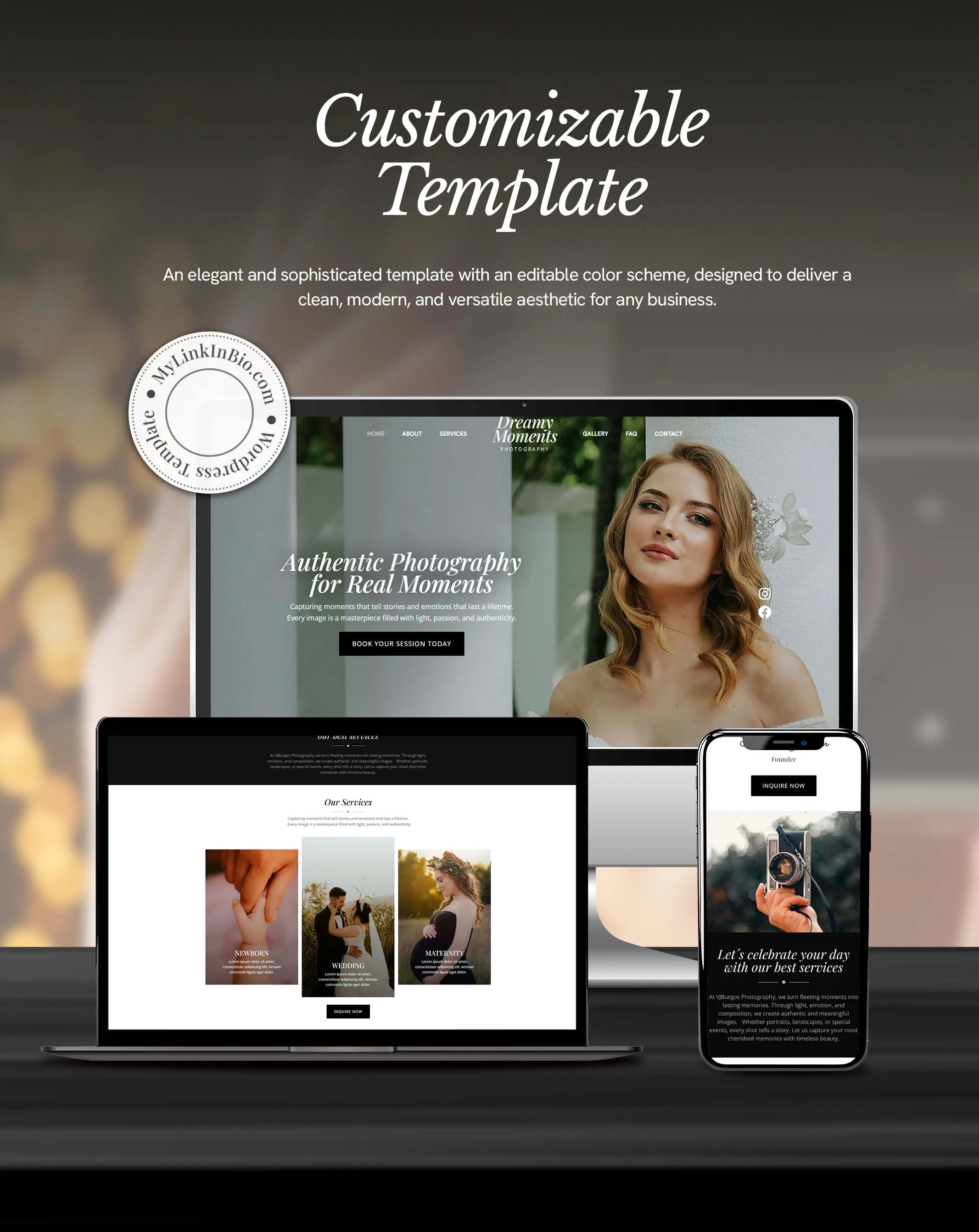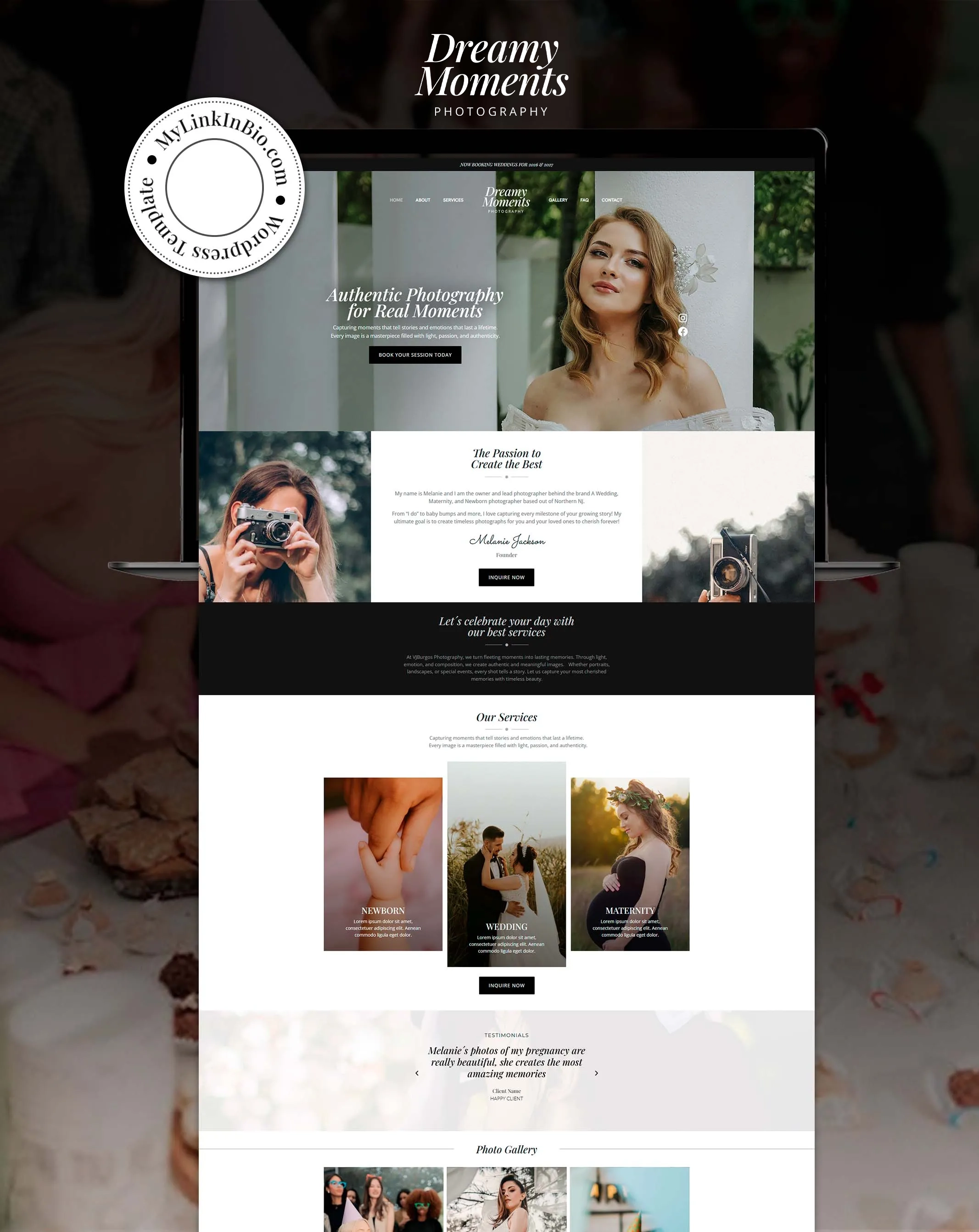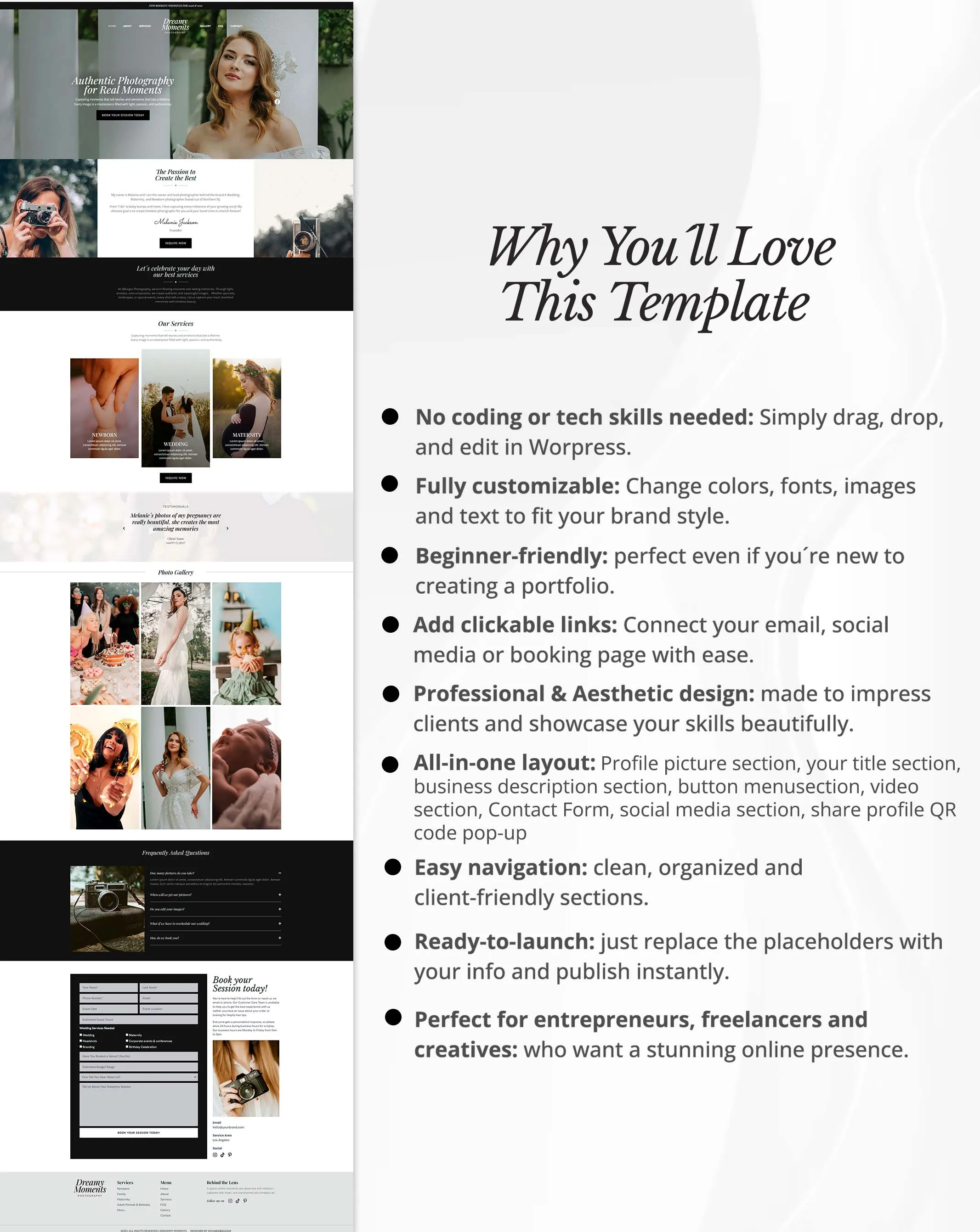 Dreamy Moments is a modern one-page WordPress website template built with Elementor, designed for photographers and creative professionals. It helps you showcase your portfolio, highlight your services, and attract new clients with a clean, elegant layout.