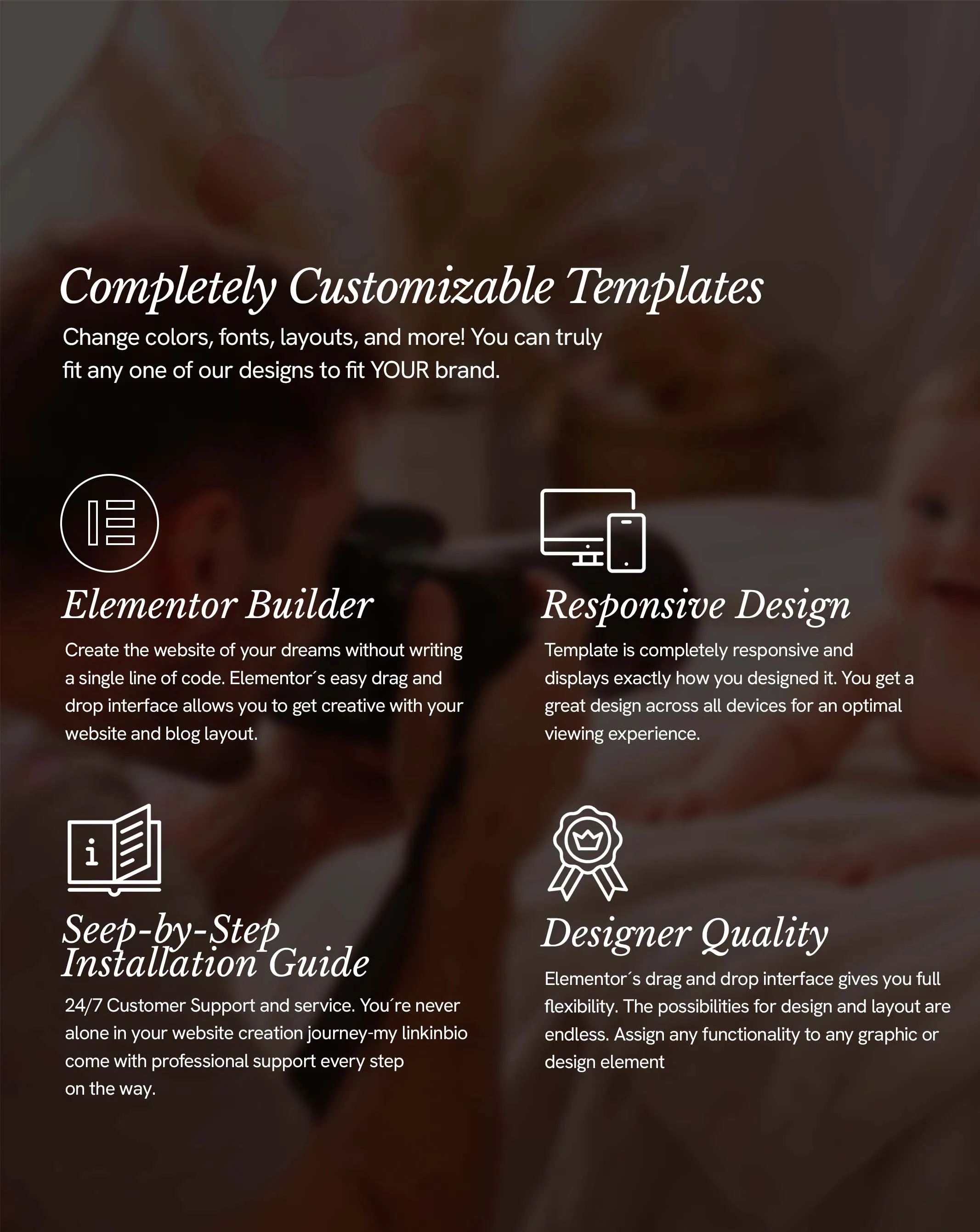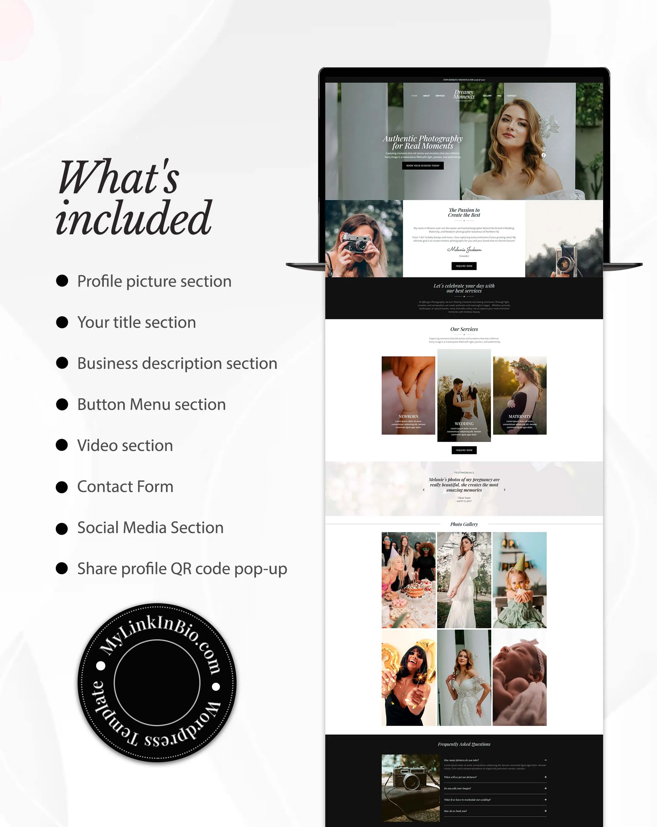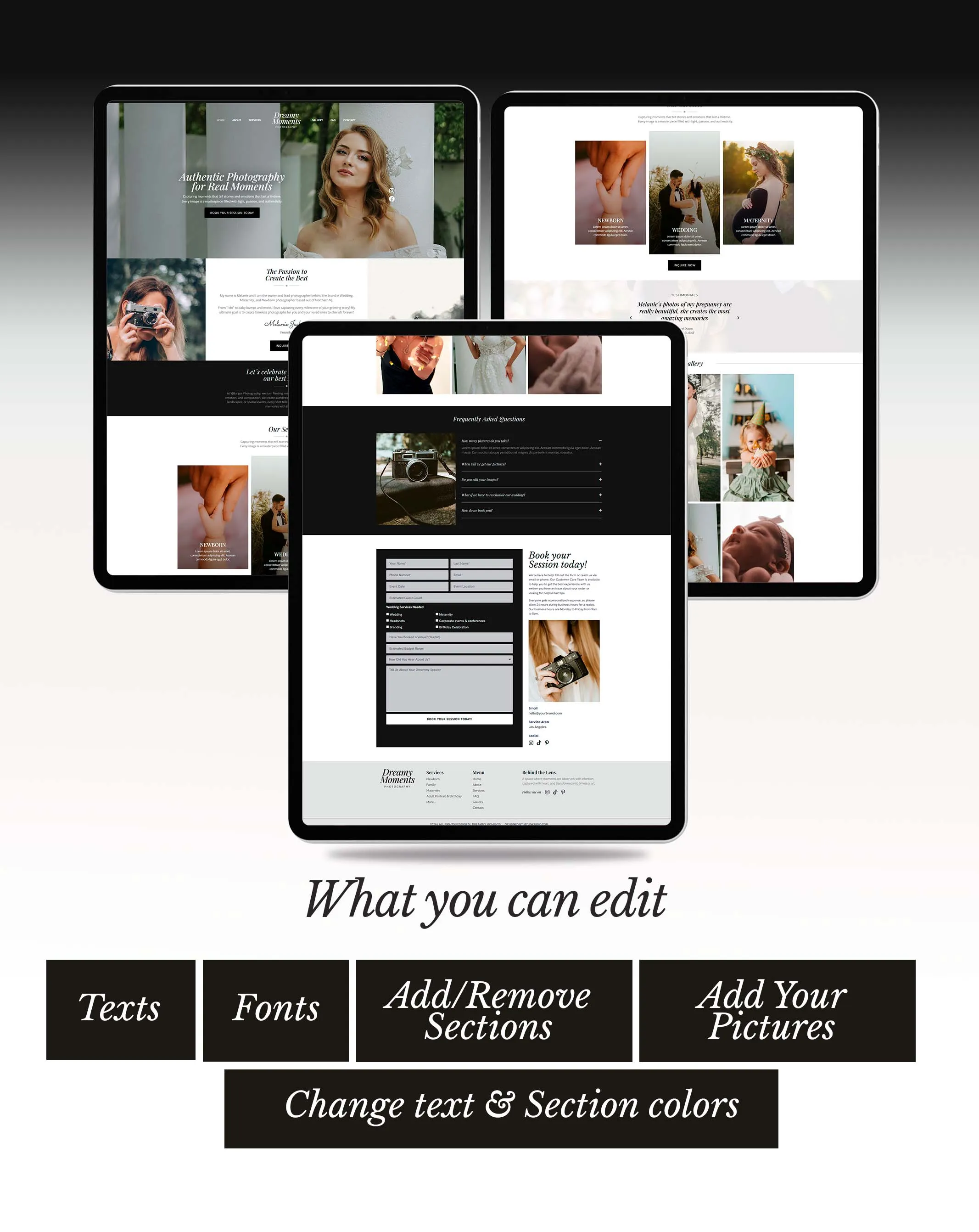 Dreamy Moments is a modern one-page WordPress website template built with Elementor, designed for photographers and creative professionals. It helps you showcase your portfolio, highlight your services, and attract new clients with a clean, elegant layout.