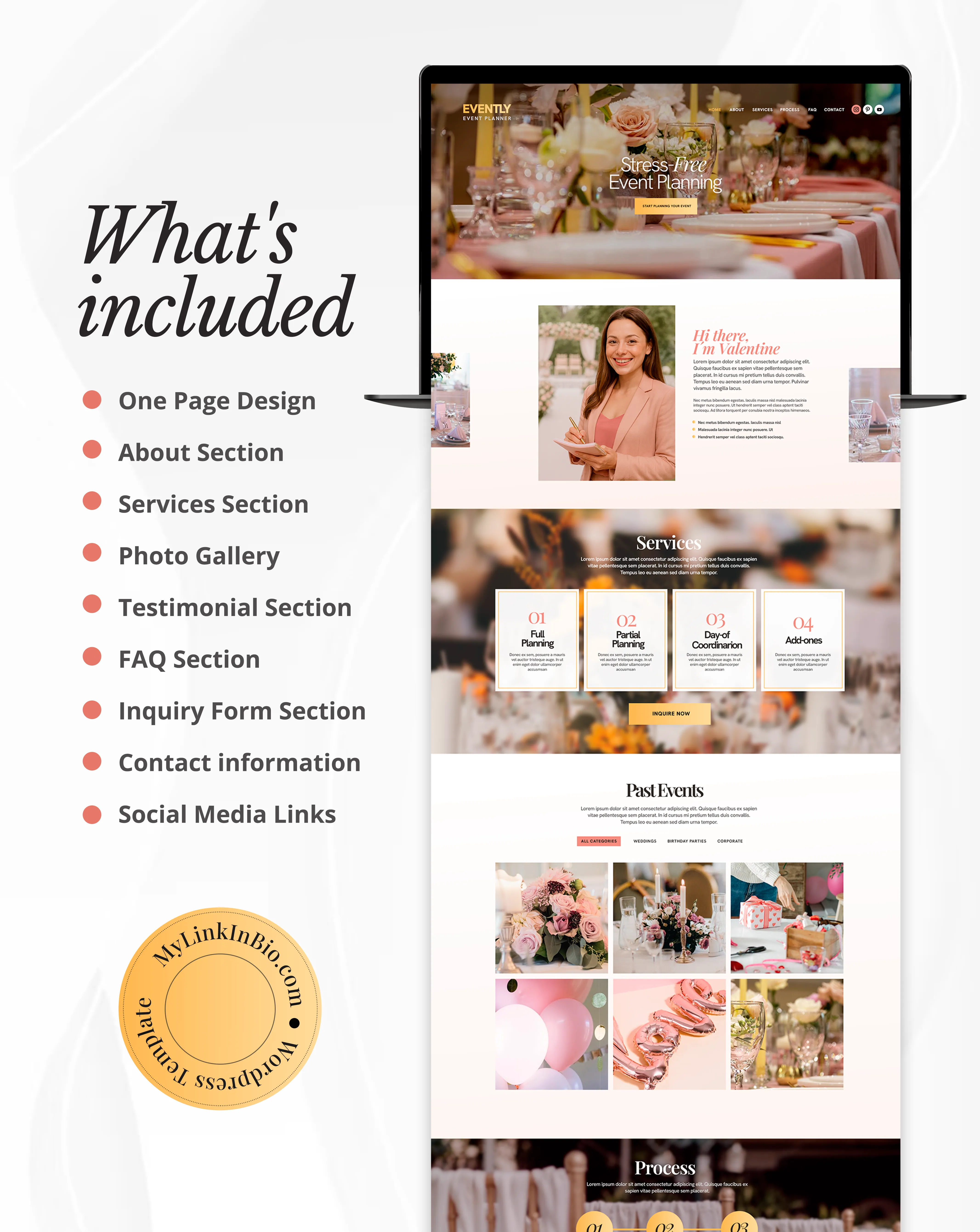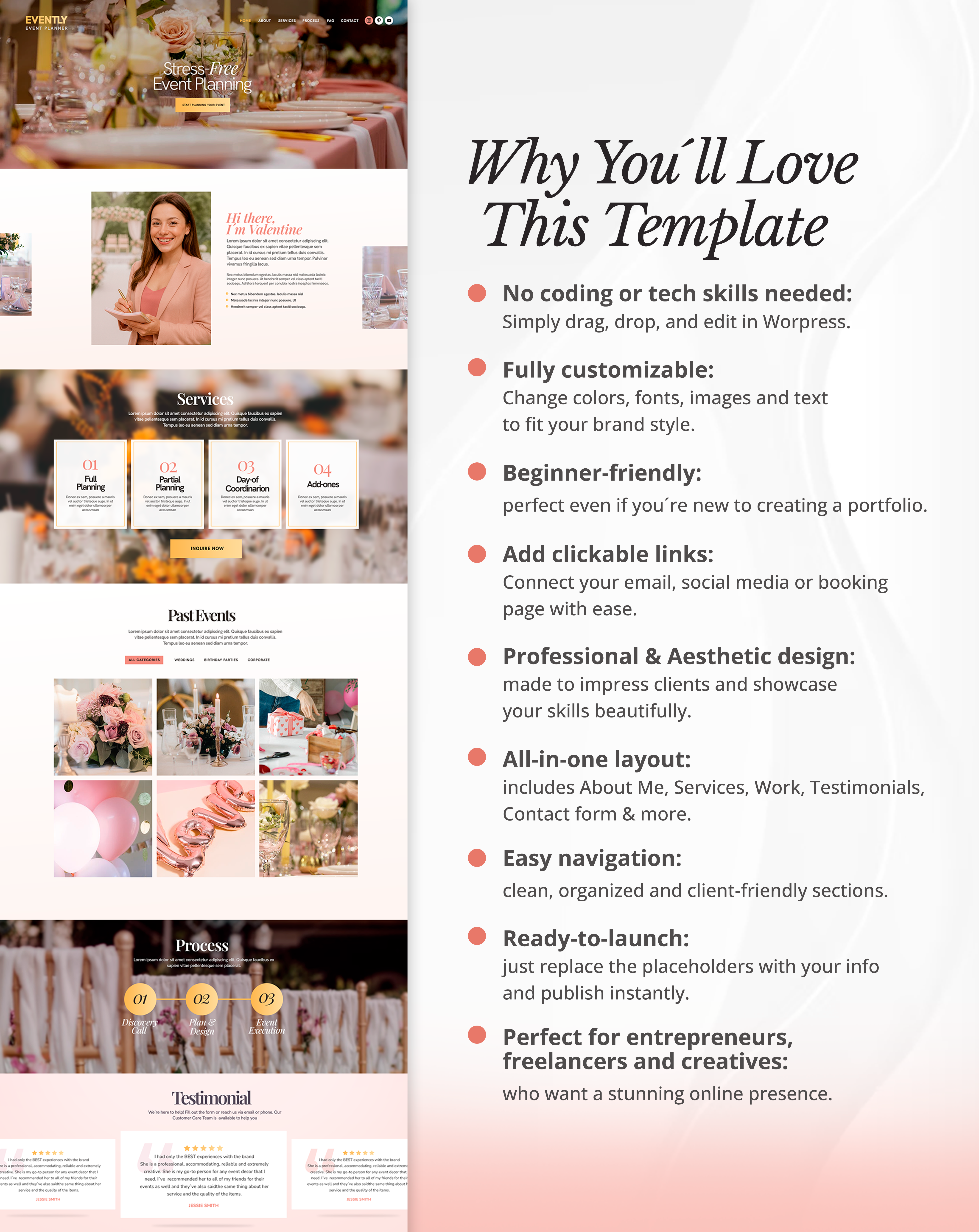 Evently is a modern one-page WordPress website template built with Elementor, designed for event planners and event professionals. It helps you showcase your services, highlight past events, and attract new clients with a clean, professional layout.
