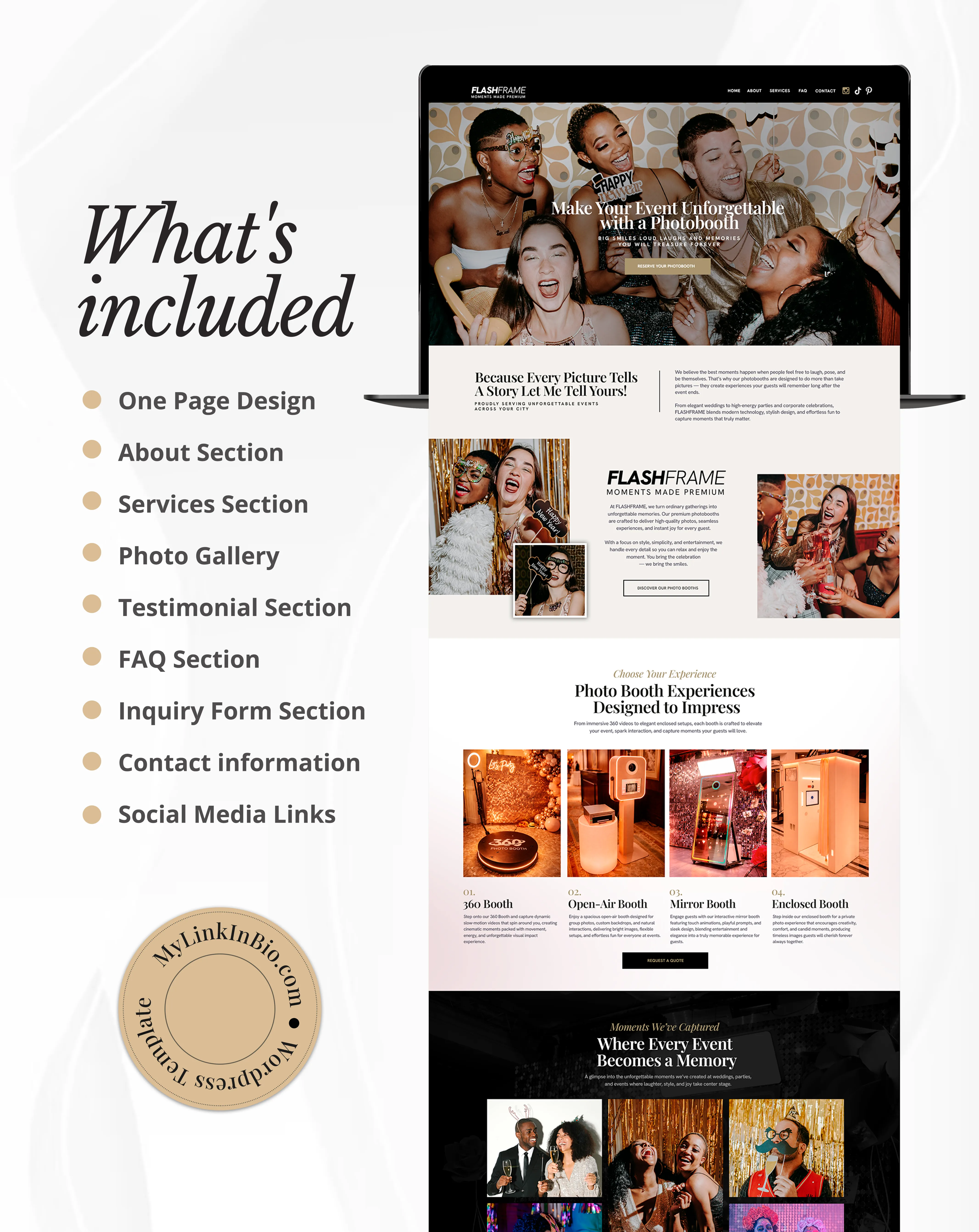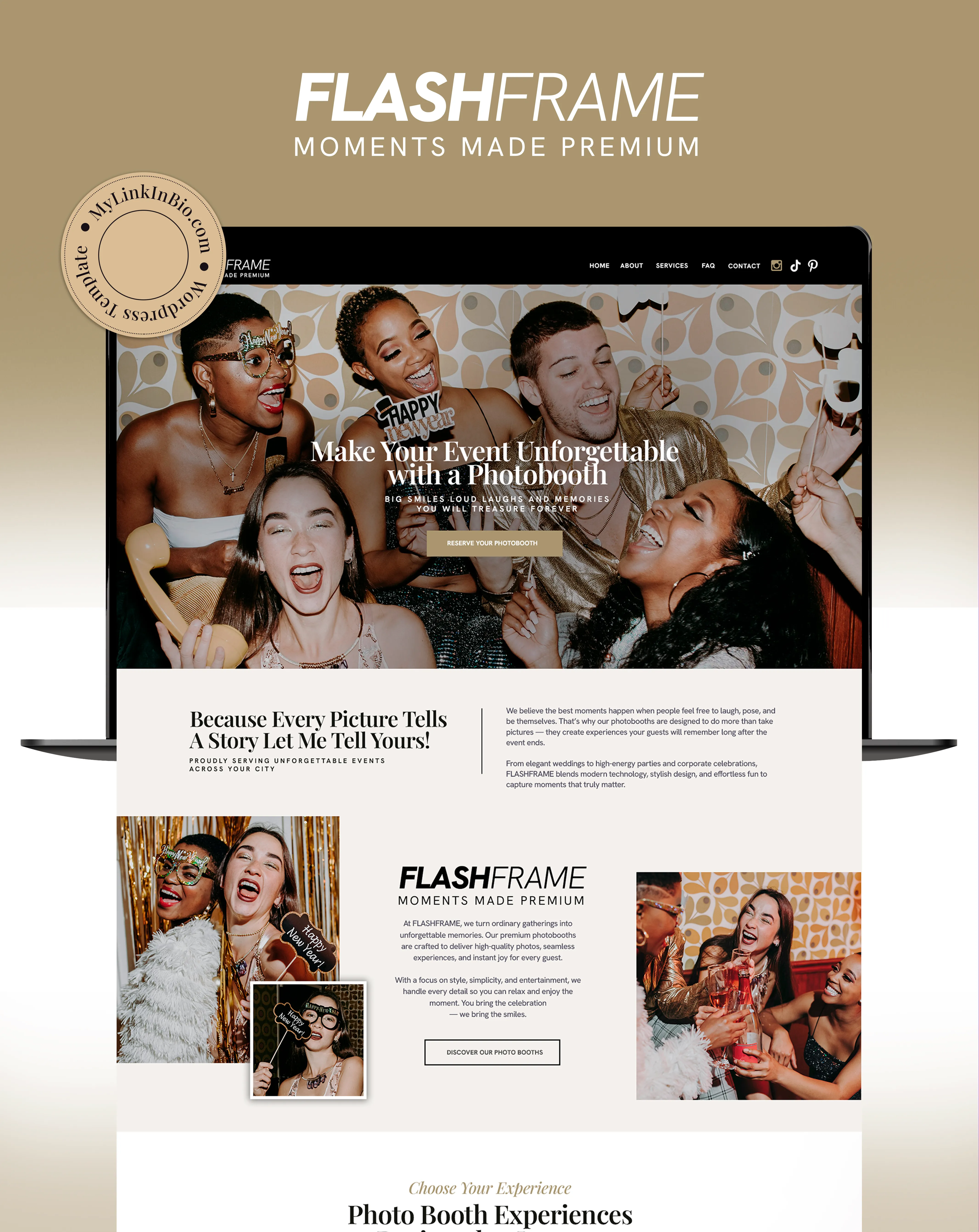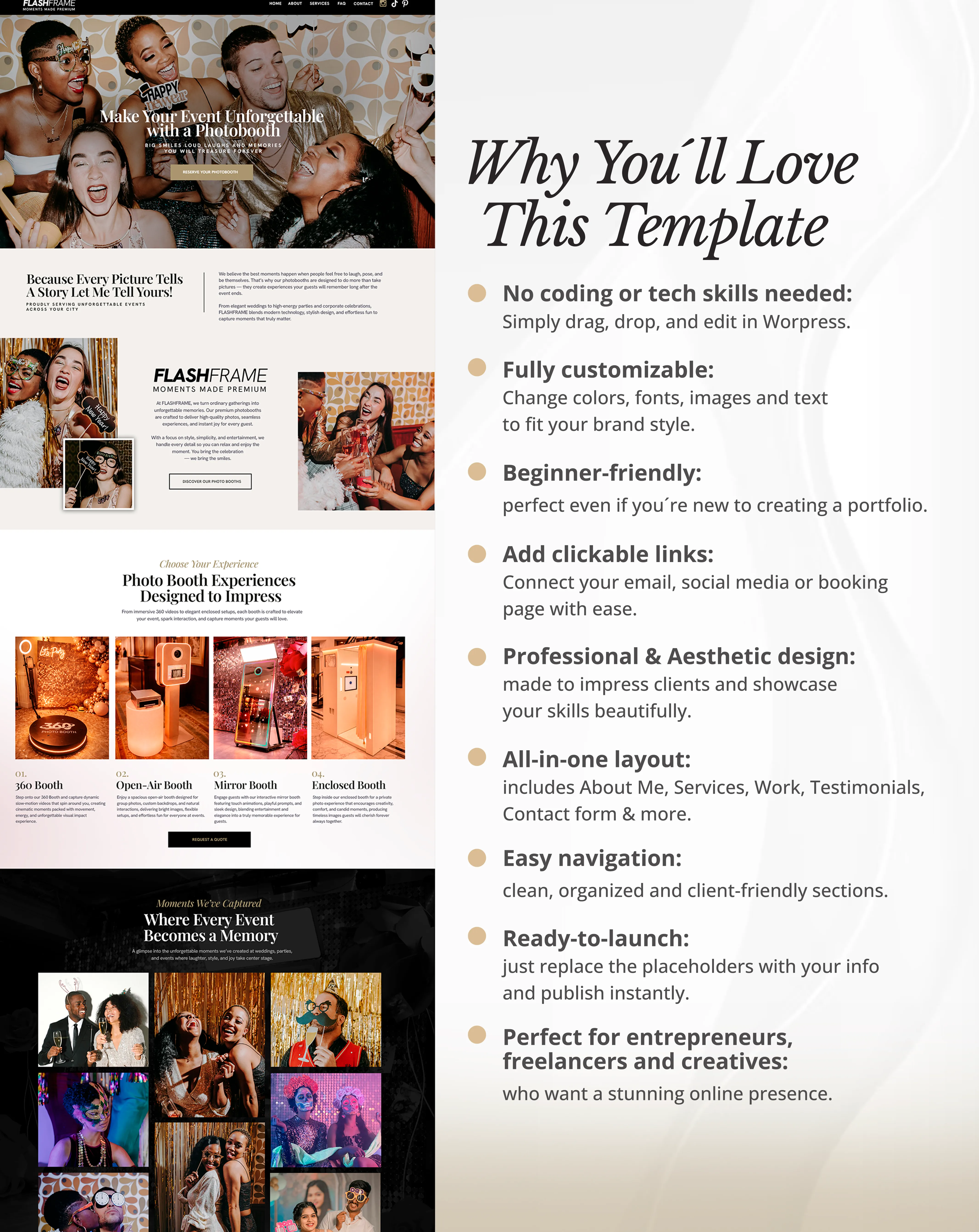 Flashframe Photobooth Company is a modern one-page WordPress website template built with Elementor, designed for photobooth companies and event businesses. It helps you showcase your services, display your work, and drive bookings with a clean, professional layout.