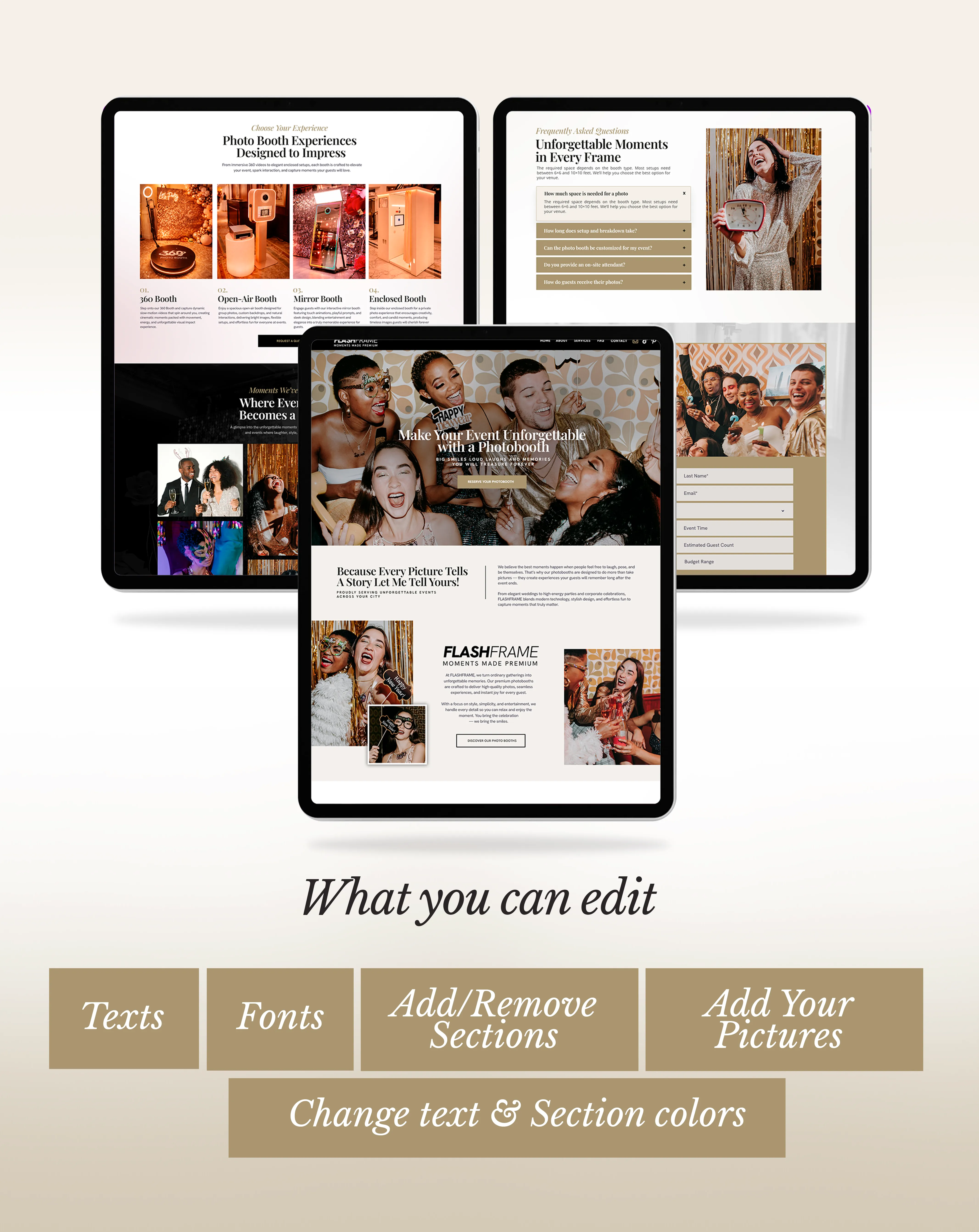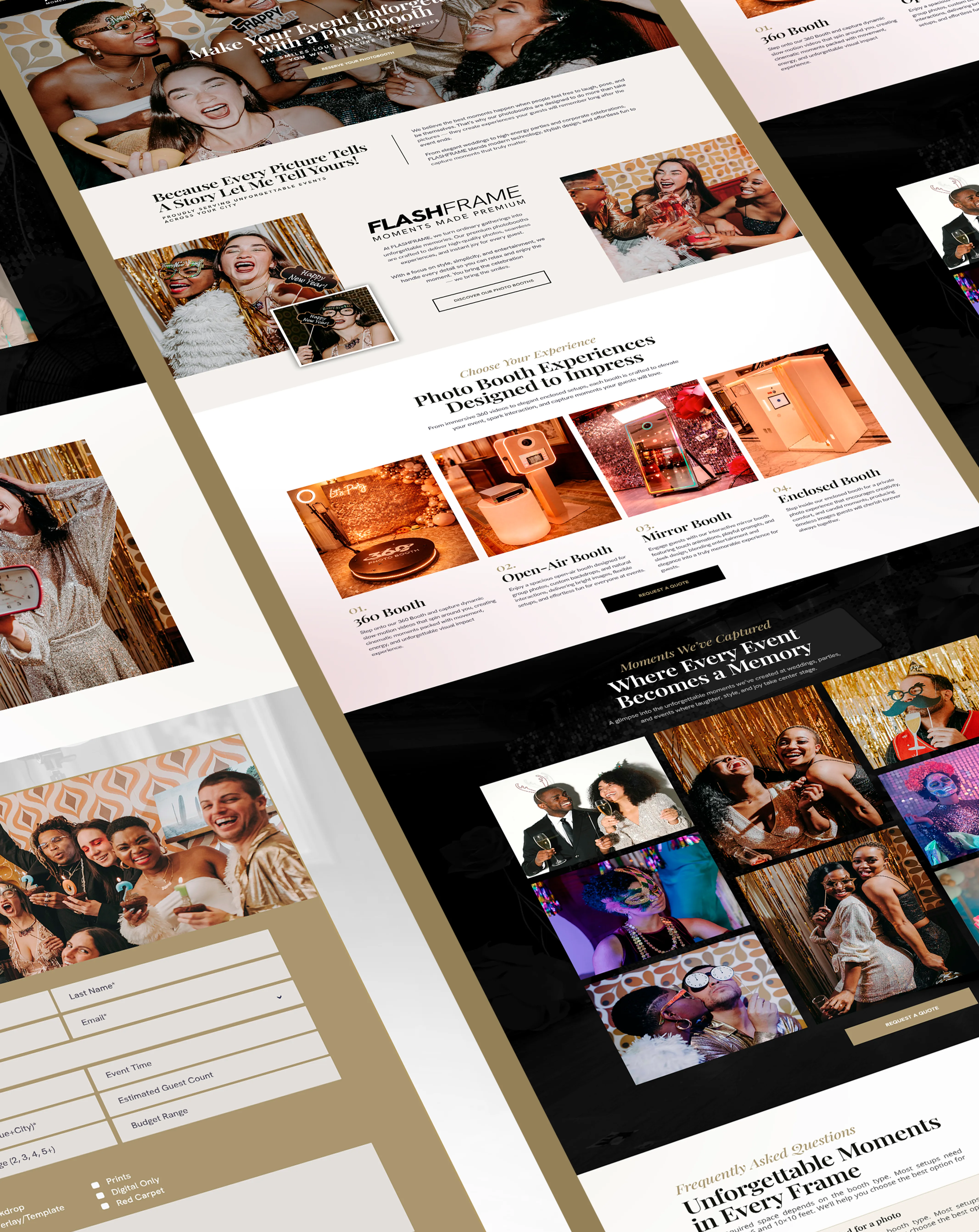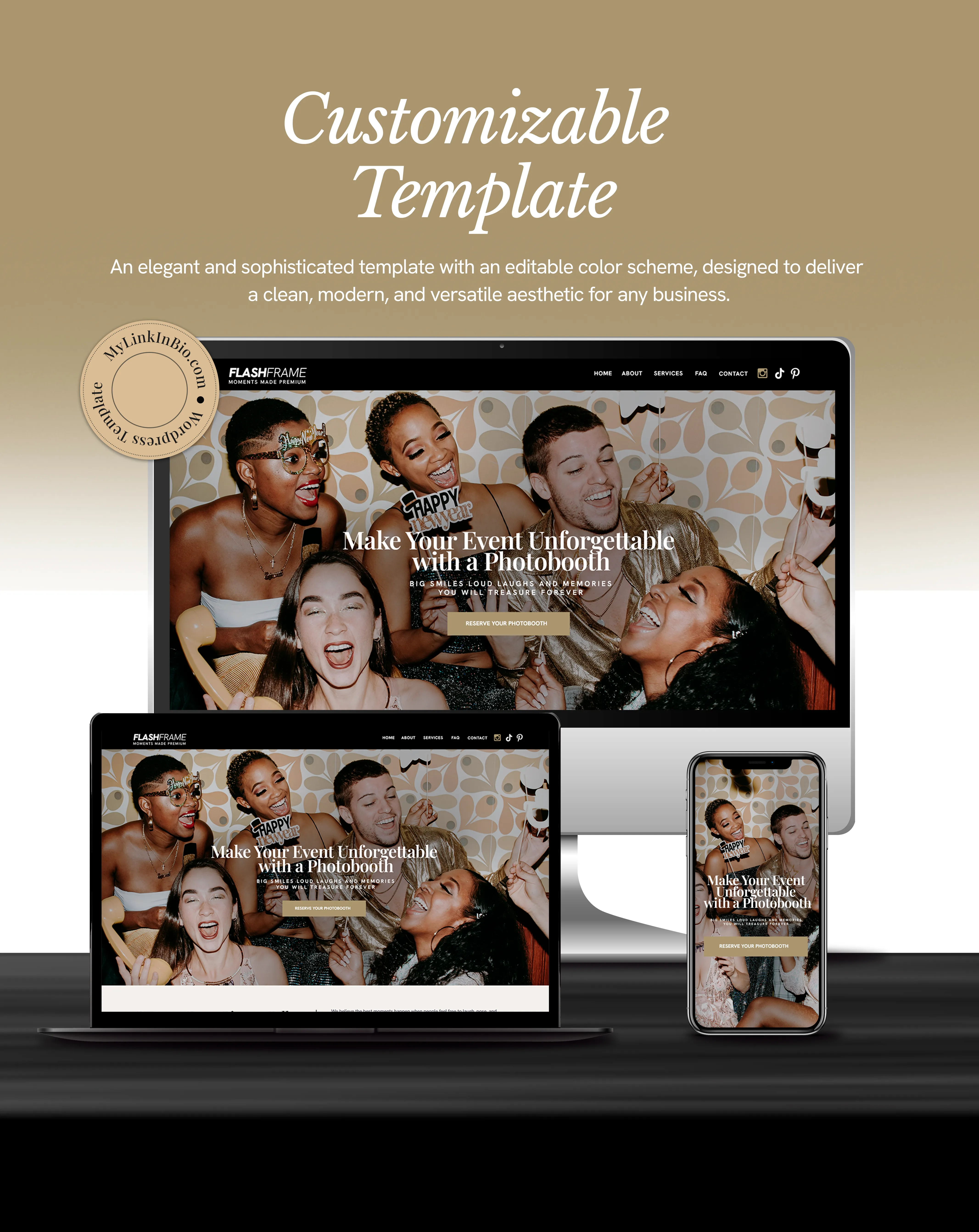 Flashframe Photobooth Company is a modern one-page WordPress website template built with Elementor, designed for photobooth companies and event businesses. It helps you showcase your services, display your work, and drive bookings with a clean, professional layout.