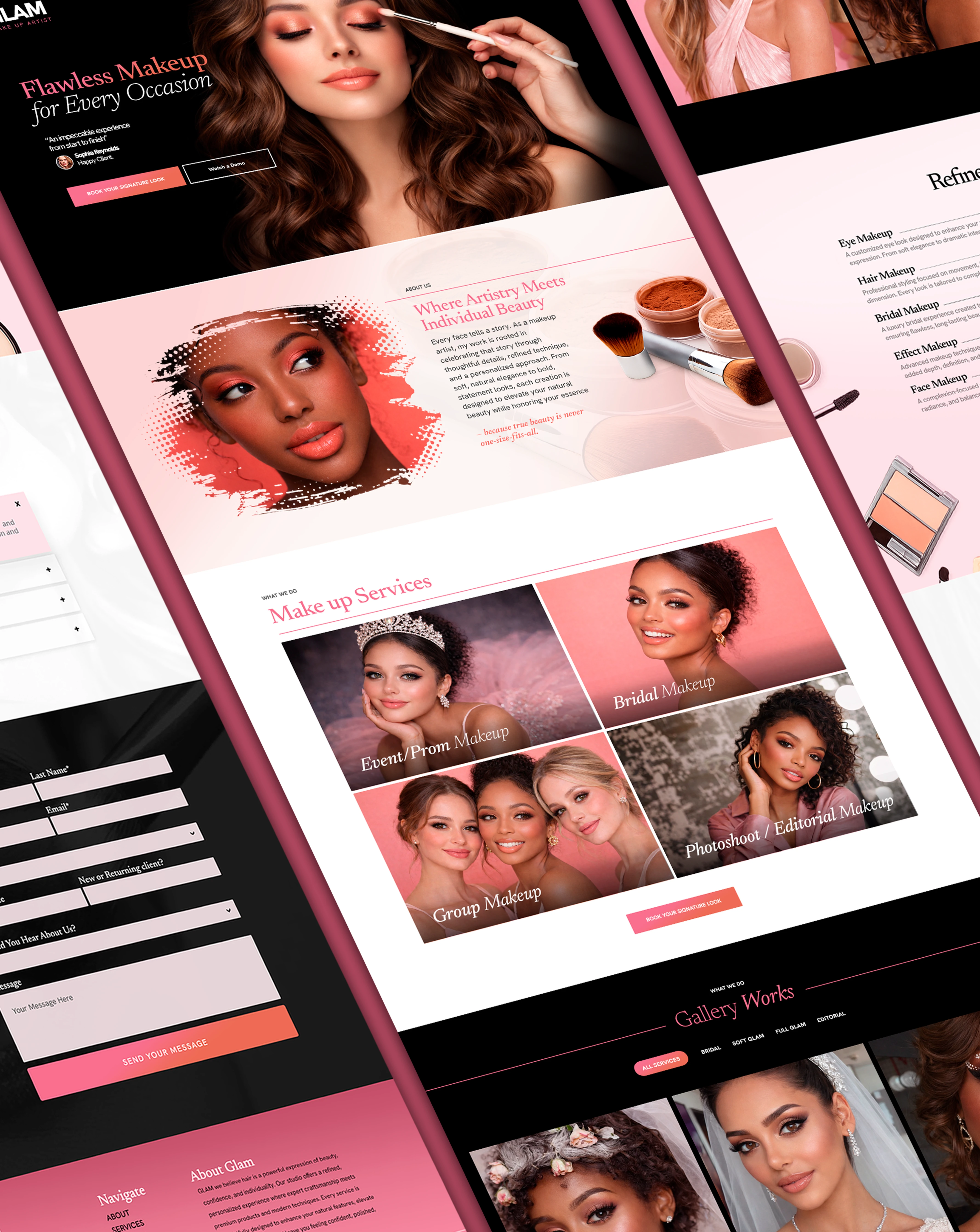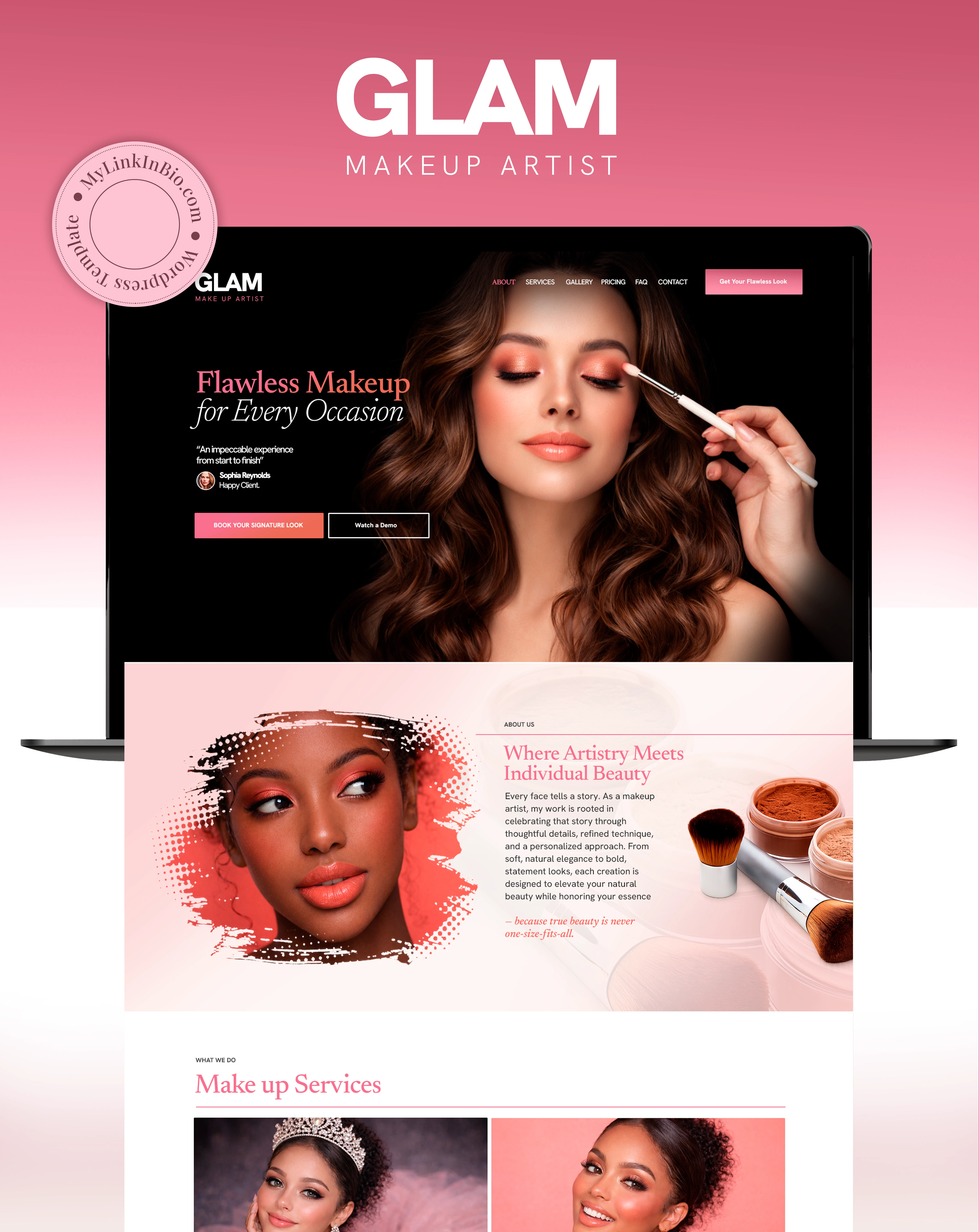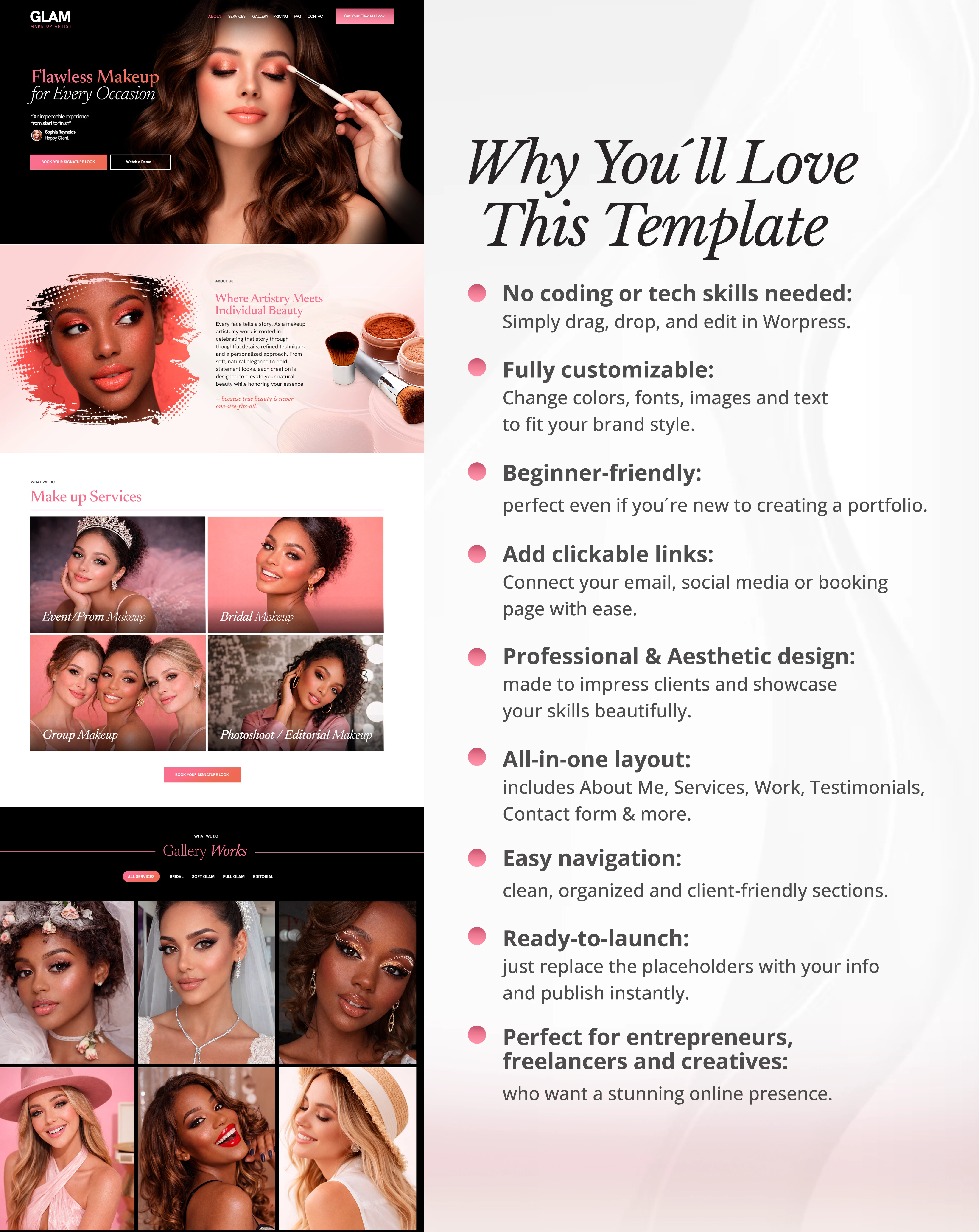 Glam is a modern one-page WordPress website template built with Elementor, designed for makeup artists and beauty professionals. It helps you showcase your services, highlight your work, and attract new clients with a clean, stylish layout.