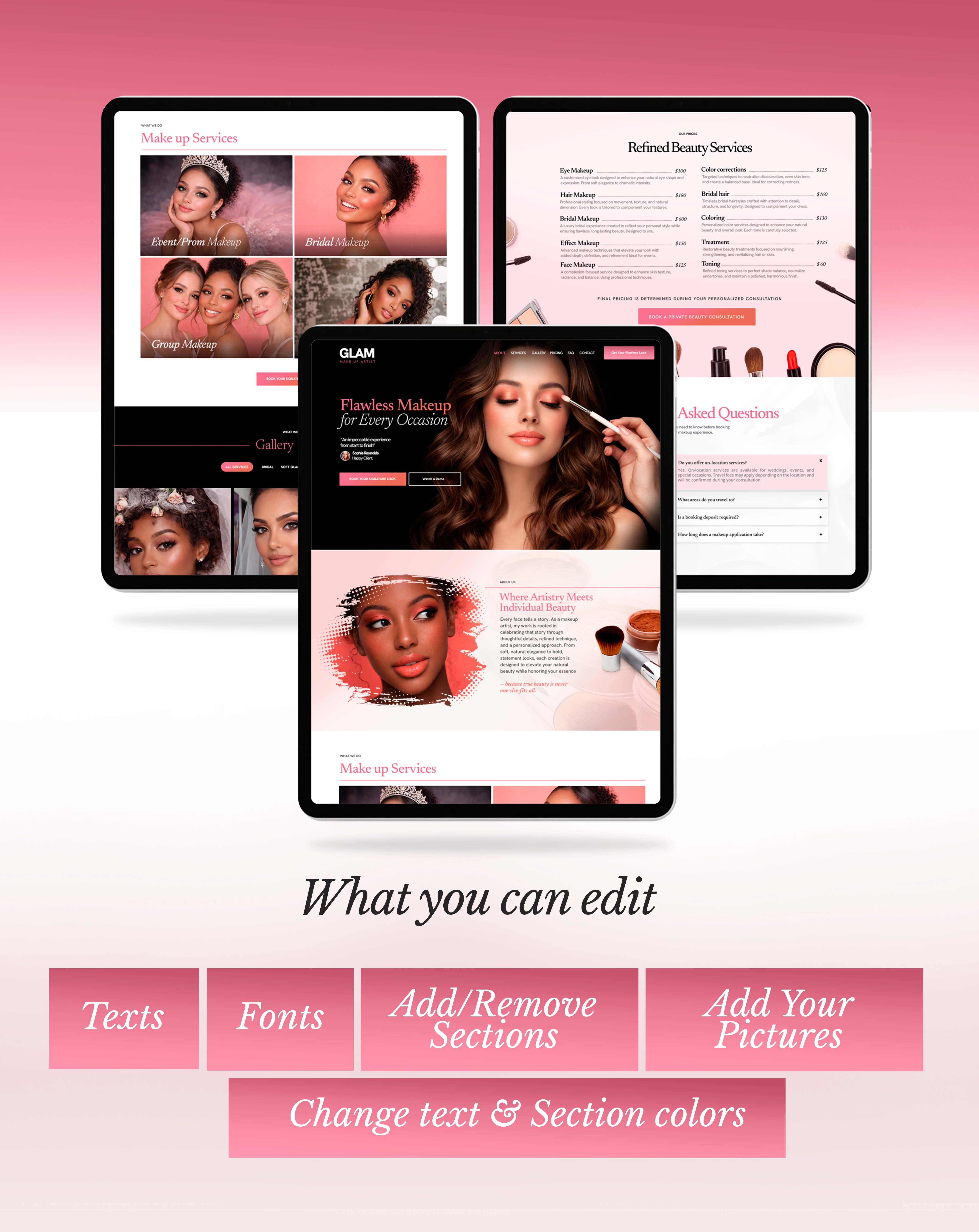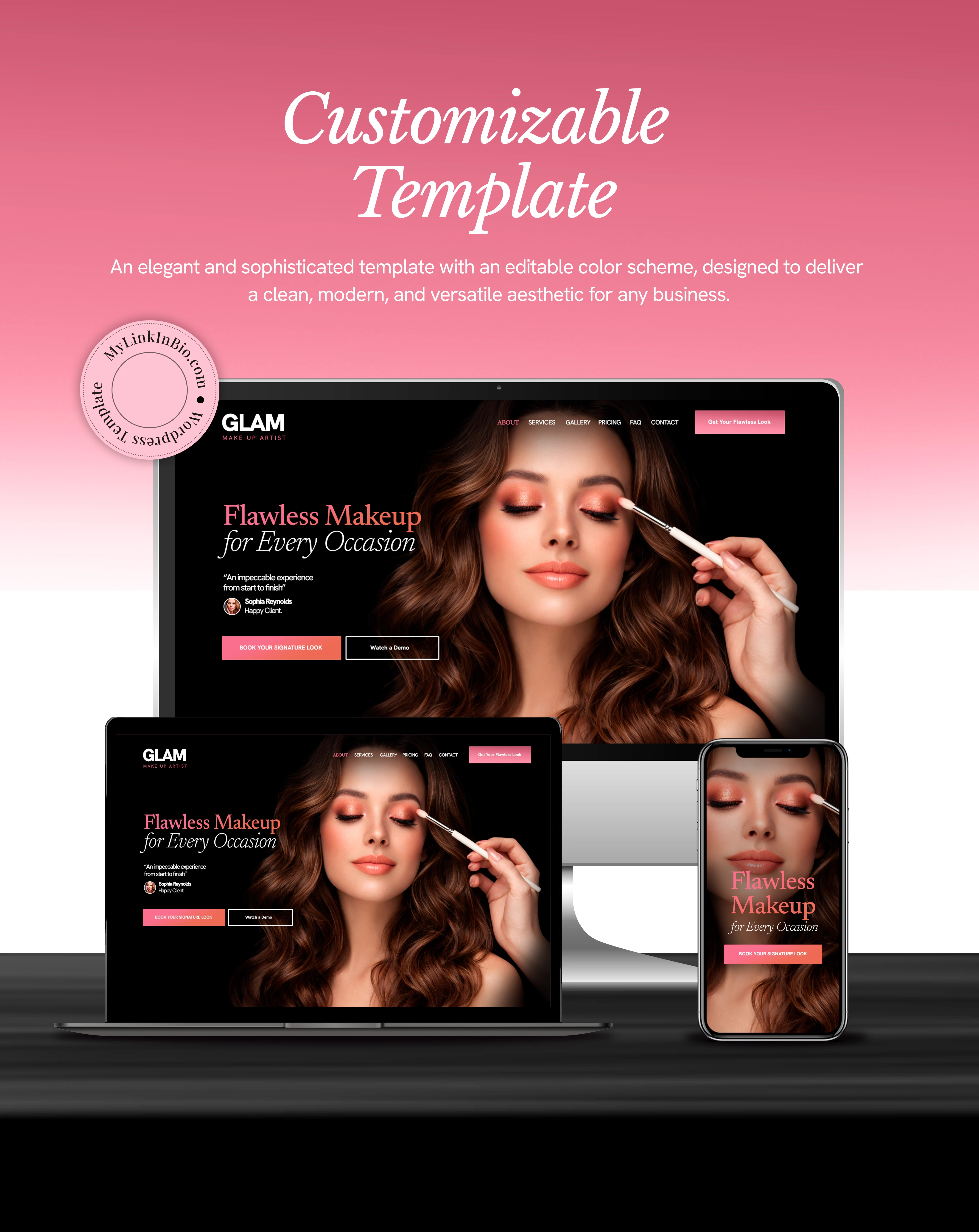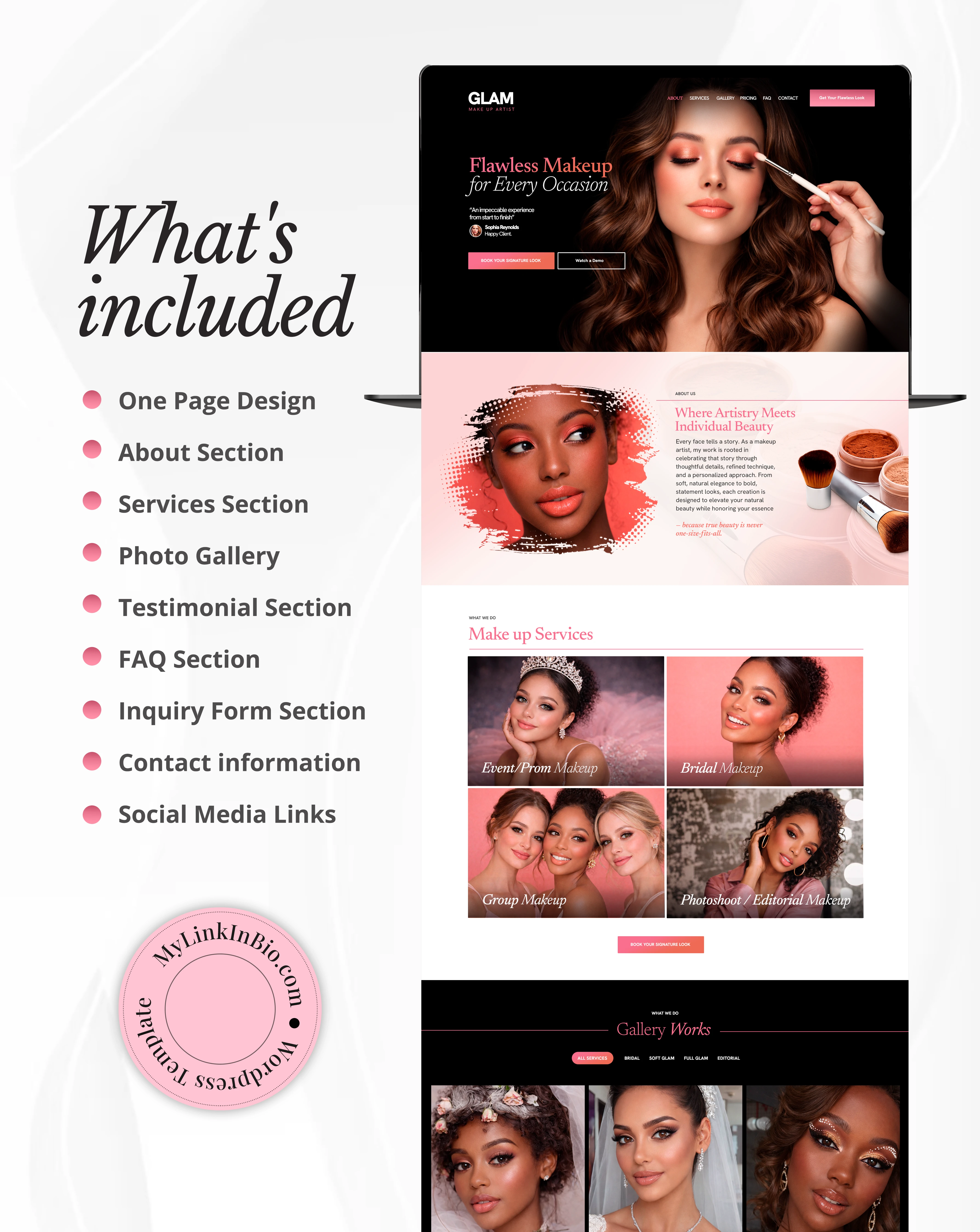 Glam is a modern one-page WordPress website template built with Elementor, designed for makeup artists and beauty professionals. It helps you showcase your services, highlight your work, and attract new clients with a clean, stylish layout.