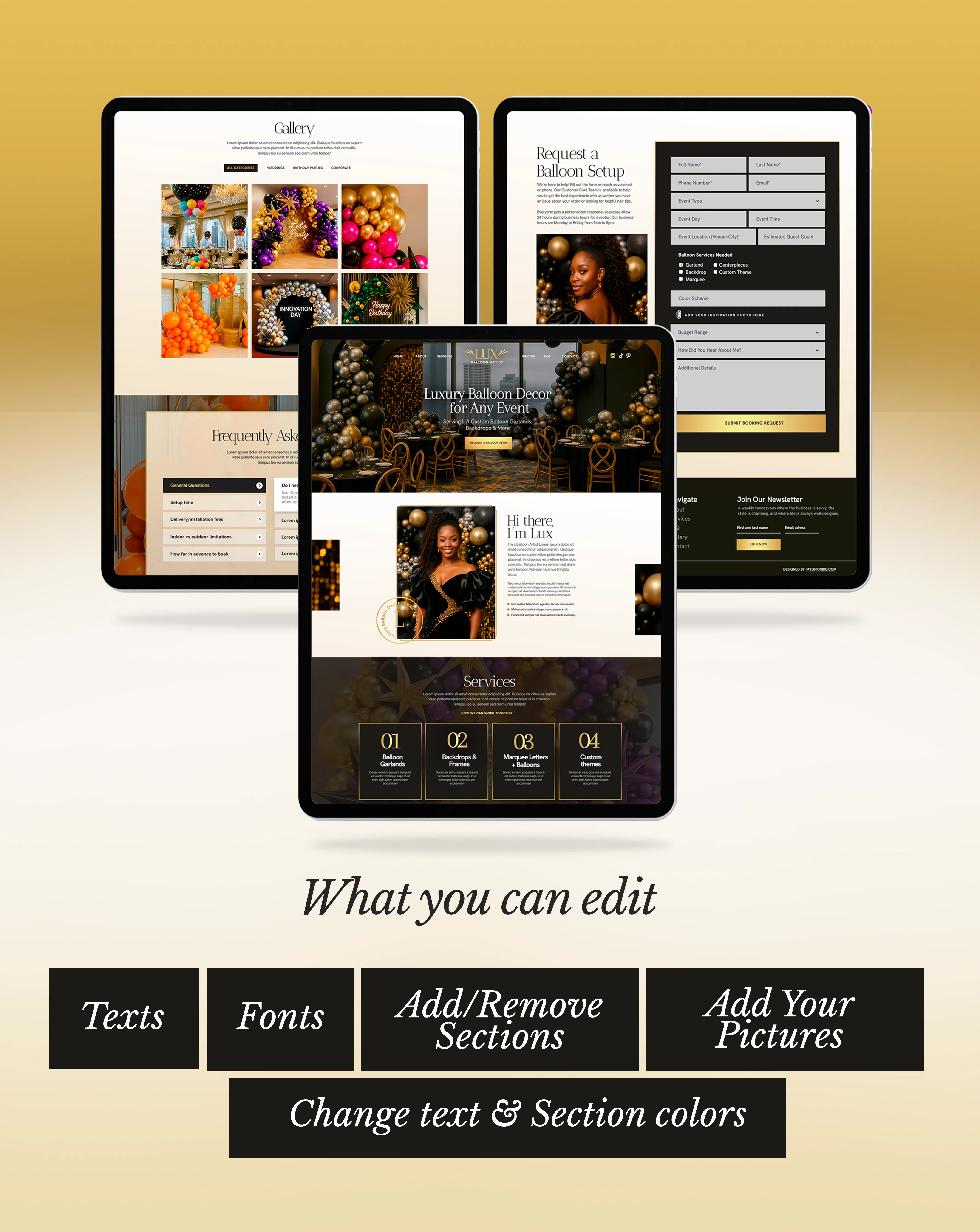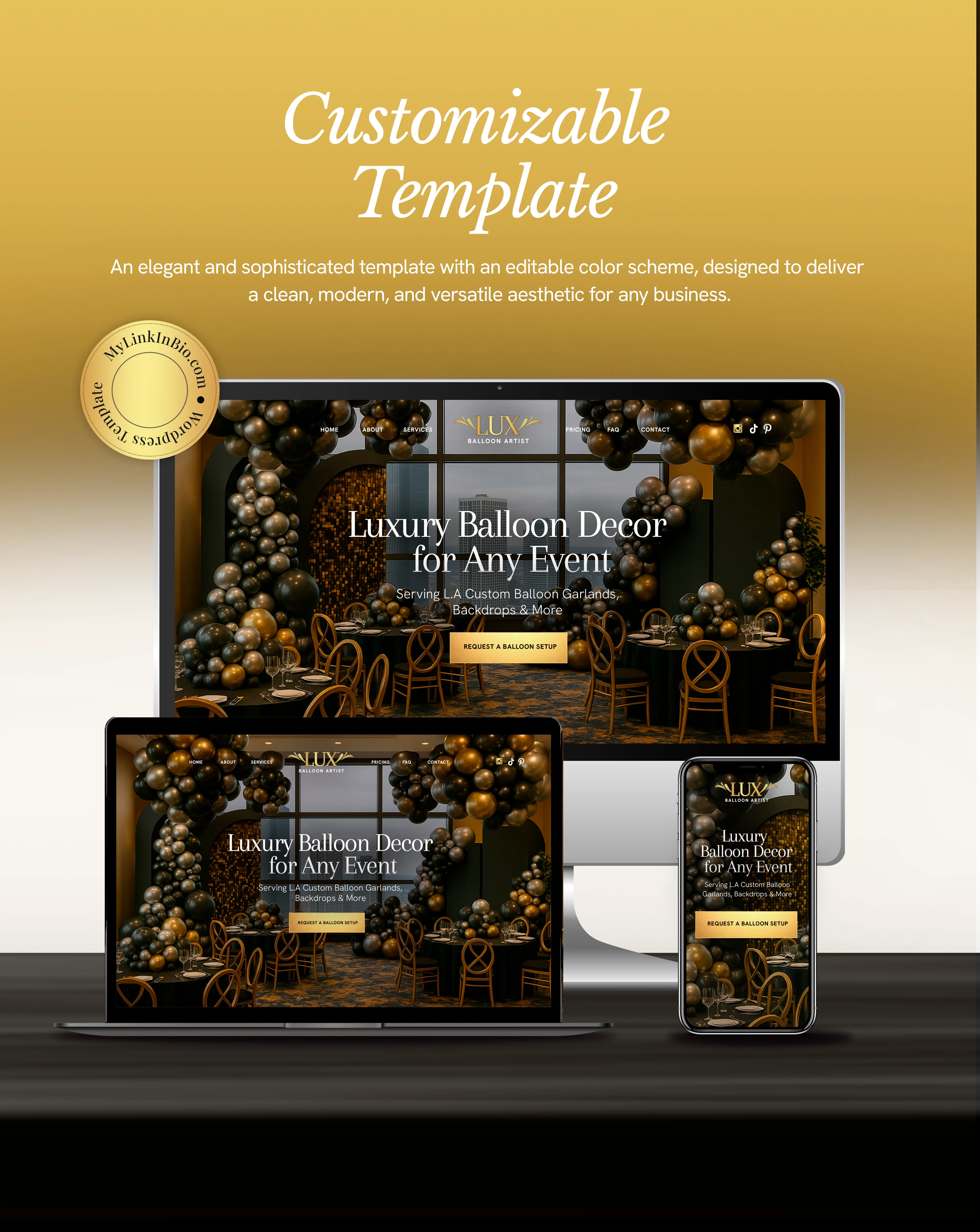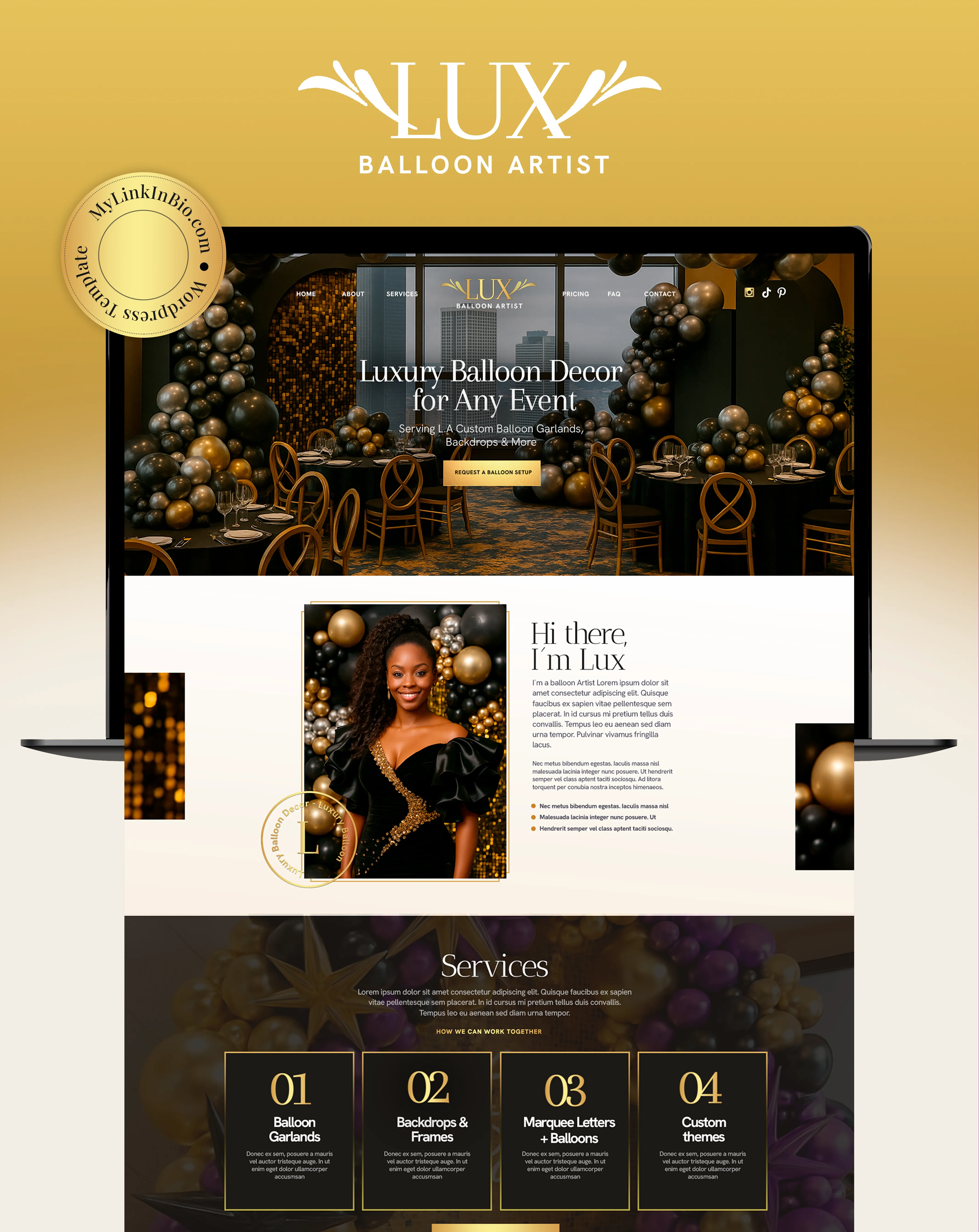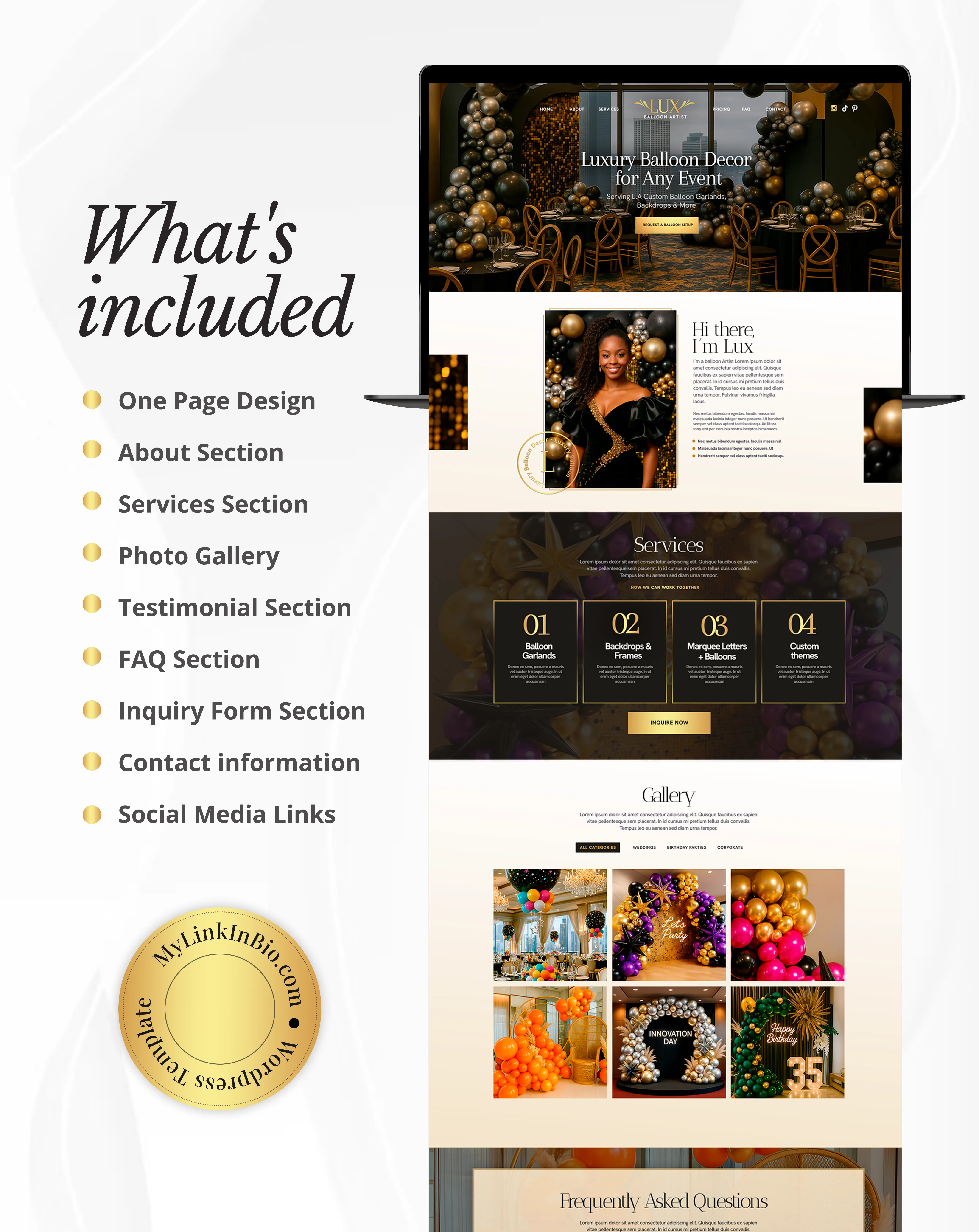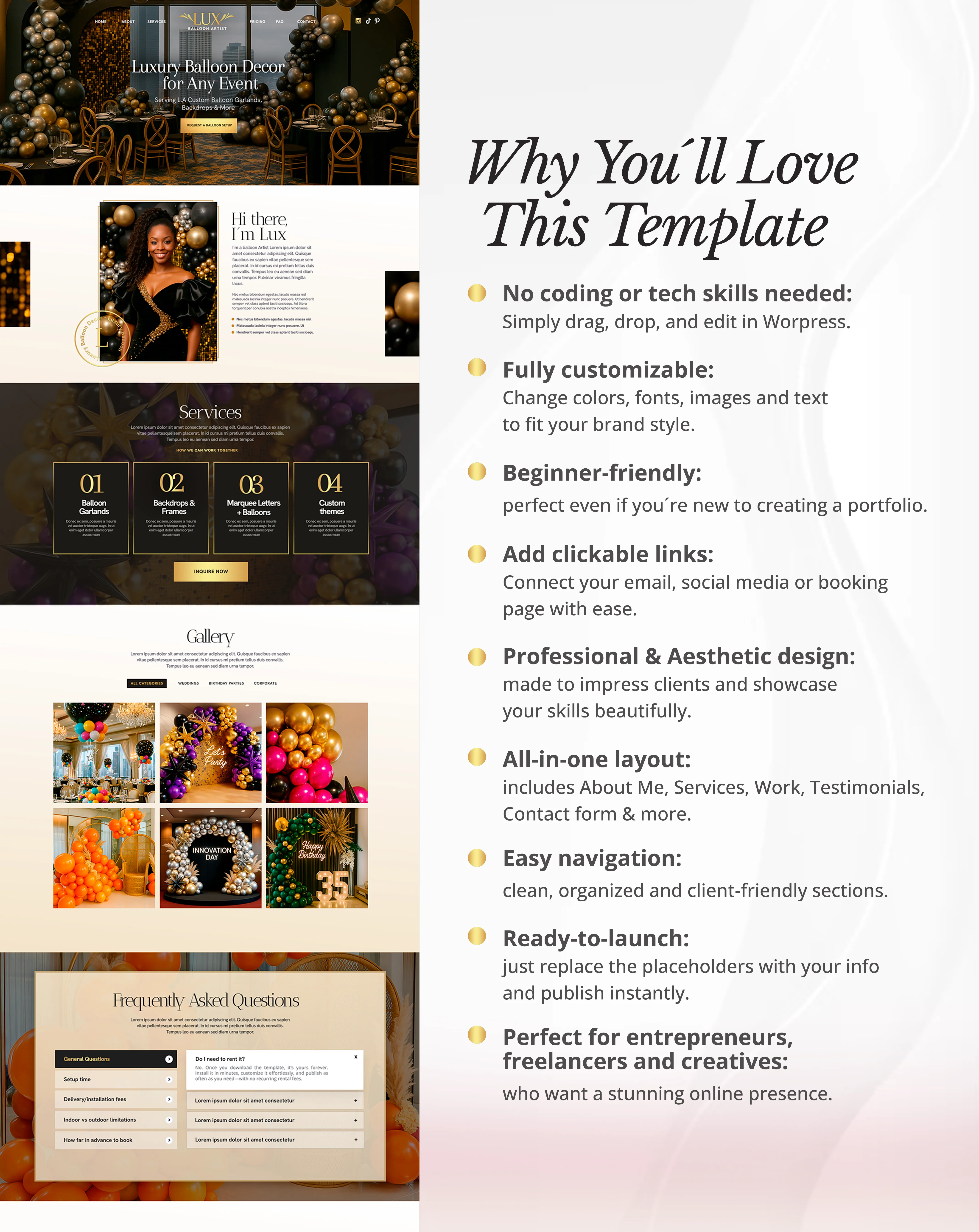 Lux is a modern one-page WordPress website template built with Elementor, designed for balloon artists and event decorators. It helps you showcase your services, highlight your work, and attract new clients with a clean, stylish layout.
